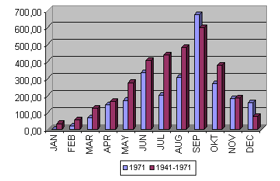 | Måned | 1971 (mm) | G.snit 30 år (mm) | Max idem (mm) | Min idem (mm) | |